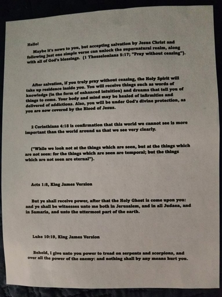 So I go inside, with the Bible. I put a gift card in it before I went inside, so I knew she’d like at least part of it. She was right inside the door and we made eye contact. She was headed to get another customer something, but detoured to me. We spoke for a second, and I just said “here, you’re working hard, you deserve this”. I MYSELF didn’t say it. The Holy Spirit used my voice and said it. I’ve had it happened before, and trust me you can tell when that’s happening. She at first didn’t want to take it, but then he eyes lit up and she was like “is that a Bible!?” And she said “I read that every day”. So I was like yes, it is. And sincw you already read it you know it’s a good book to read, right? And you can never have too many, and if you already have plenty you can also give it to someone who doesn’t have one”. She happily took it and leaned over and said THANK YOU and hugged me in front of everyone. I just smiled, hugged back, and said “you’re welcome, have a good holiday”. Not cuz I approve of her Halloween thing, but it was a nice thing to say and being nice will assure her continued reading of the Bible and the paper I put inside it. Which will hopefully open up her eyes that God is supernatural.
